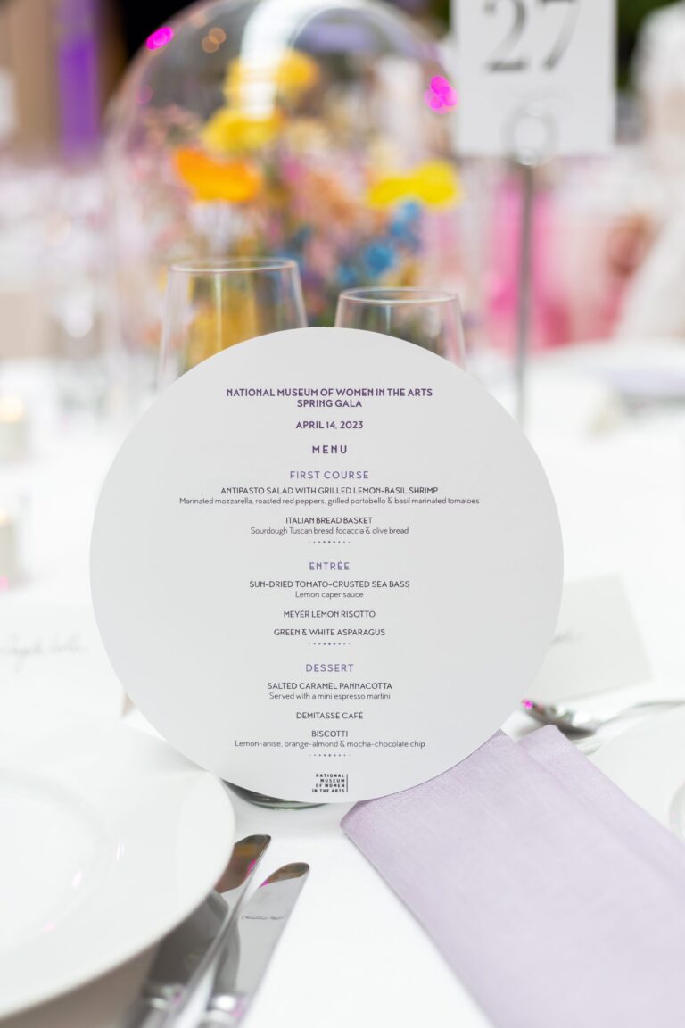 Linder knew the impact of each detail for the Spring Gala celebrated those integral to championing and supporting women in the arts. We highlighted the intentionality of branding and thematic elements throughout the evening, from menu cards adorned with art of a woman’s face, a backdrop with the NMWA namesake to provide the perfect photo opportunity for attendees, beautiful jazz entertainment provided by NYC-based band Carte Blanche, and curated menus and cocktails to celebrate the partnership with the Embassy of Italy for providing the venue.
